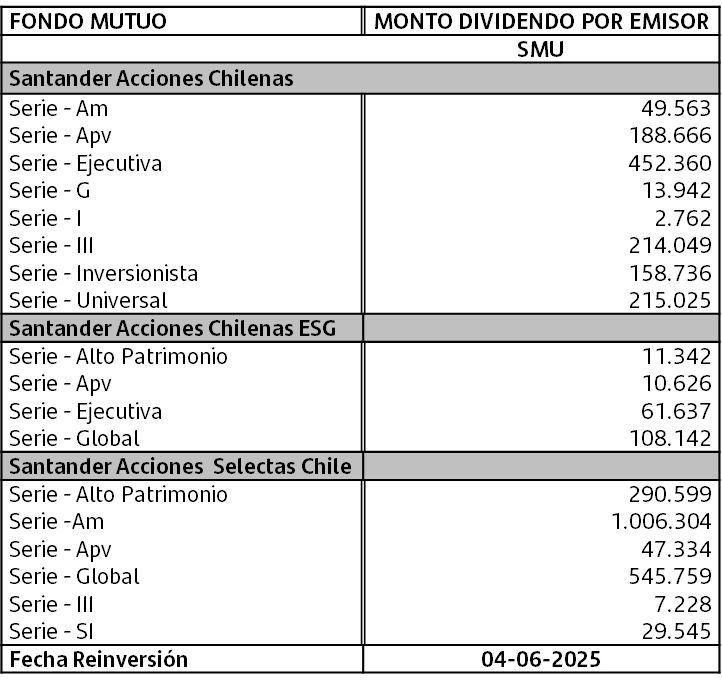 Se comunica a los señores partícipes de Fondos Mutuos Santander Acciones Chilenas, Santander Acciones Chilenas ESG y Santander Acciones Selectas Chile, que, de acuerdo con lo estipulado en los respectivos Reglamentos Internos, y en conformidad a lo dispuesto en el artículo 80 de la Ley. N° 20.712 de 2014, la Sociedad Administradora ha repartido durante el mes de junio 2025 el siguiente beneficio correspondiente a dividendos percibidos, distribuidos por las sociedades anónimas abiertas en que se encuentran invertidos los recursos de los citados Fondos, los cuales han sido reinvertidos en cuotas de los respectivos fondos, según se indica a continuación:
